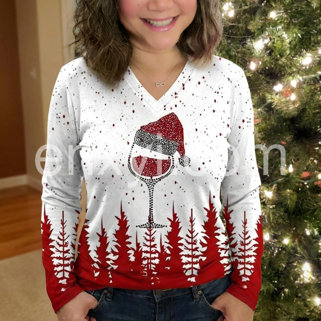 Spread holiday cheer with this long sleeve v-neck top! A dotted mosaic creates a tipsy red wine glass Santa Claus hat print, setting a fun and flirty mood for your next Christmas party. ย Red pine trees add the perfect backdrop for any time you need a joyful reminder of your favorite time of year.