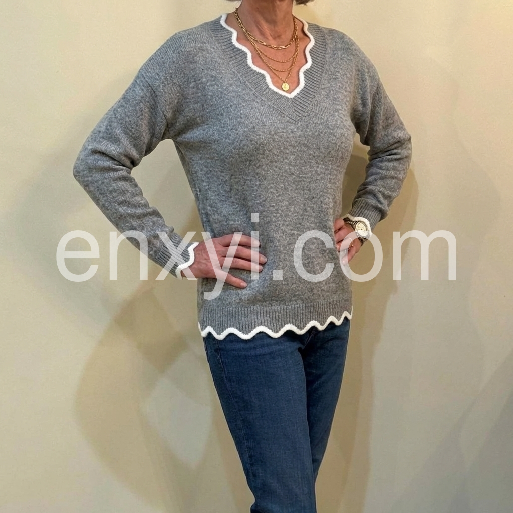 Grey Sweater with White Ruffle Trim